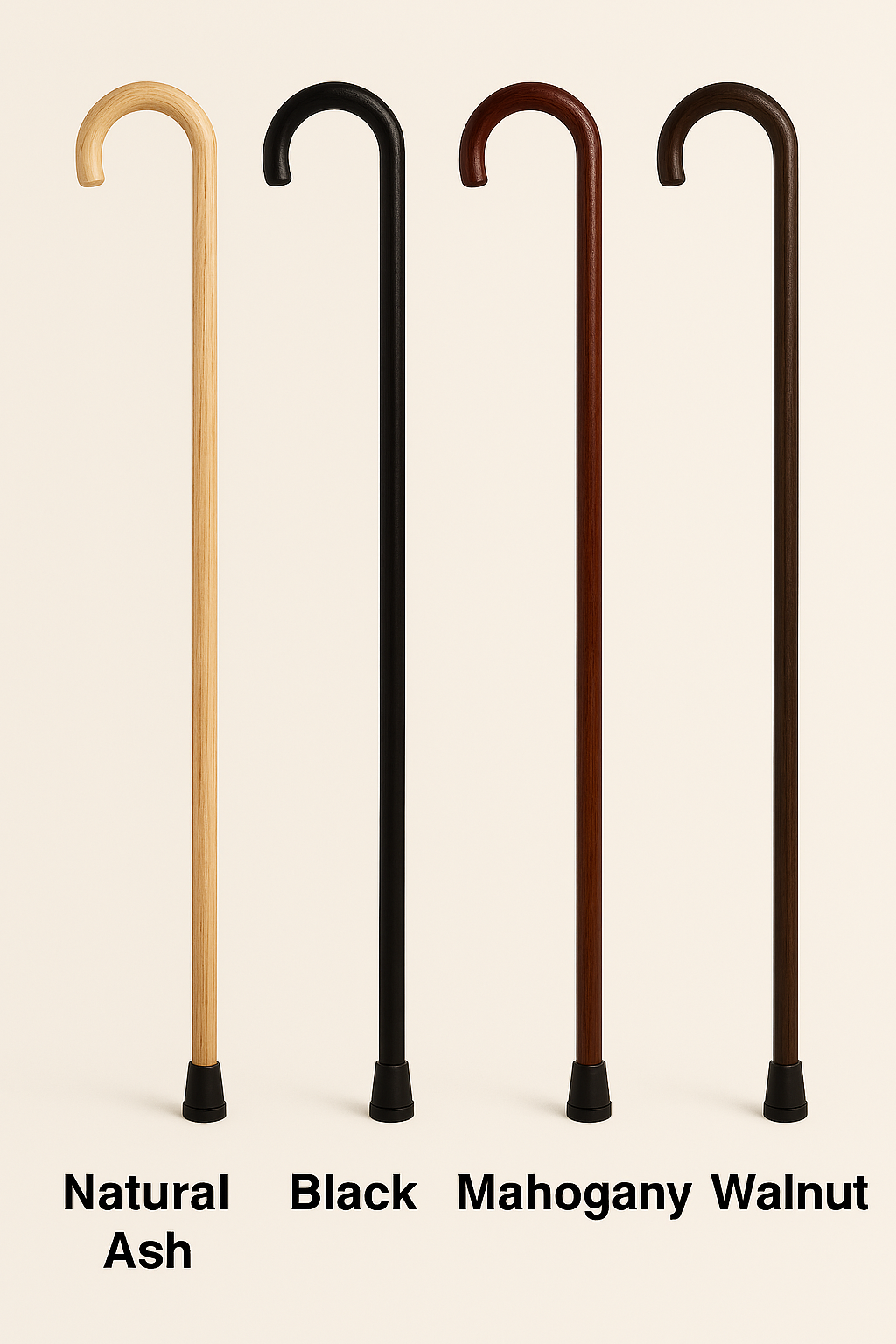 Available in four elegant finishes — Natural Ash, Black, Mahogany, and Walnut — these canes complement any wardrobe and are suitable for daily use, rehabilitation, or as a stylish mobility accessory.